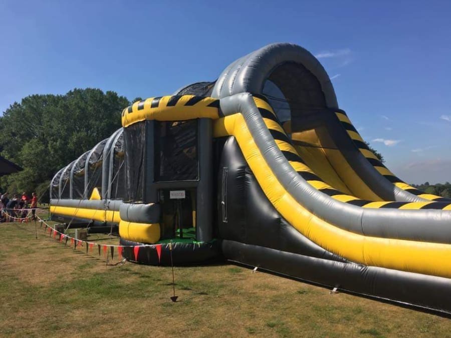 The space needed for the inflatable Assault course is approx. 100f x 15ft but we do have a smaller one available which is 70ft x 10ft. The Assault course can only be set up on a grassed area due to needing to be secured into the ground. We supply all logistical needs included in the cost and safety mats will also be provided as standard.
