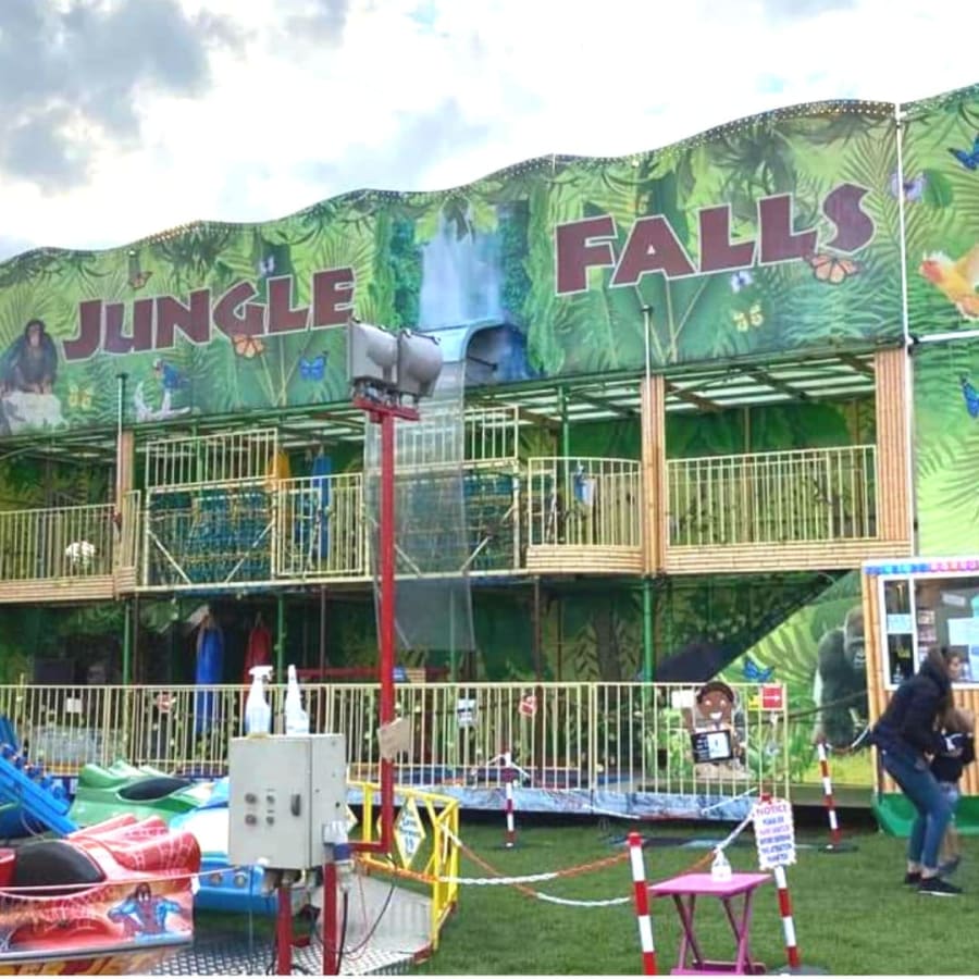 This Funhouse has been designed in a Jungle Theme, Named Jungle Falls it has rope bridges, Slides, Water Features, Jungle props, Moving Floors and Punch bags