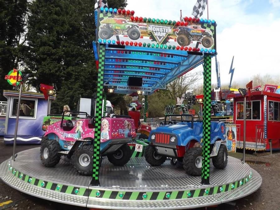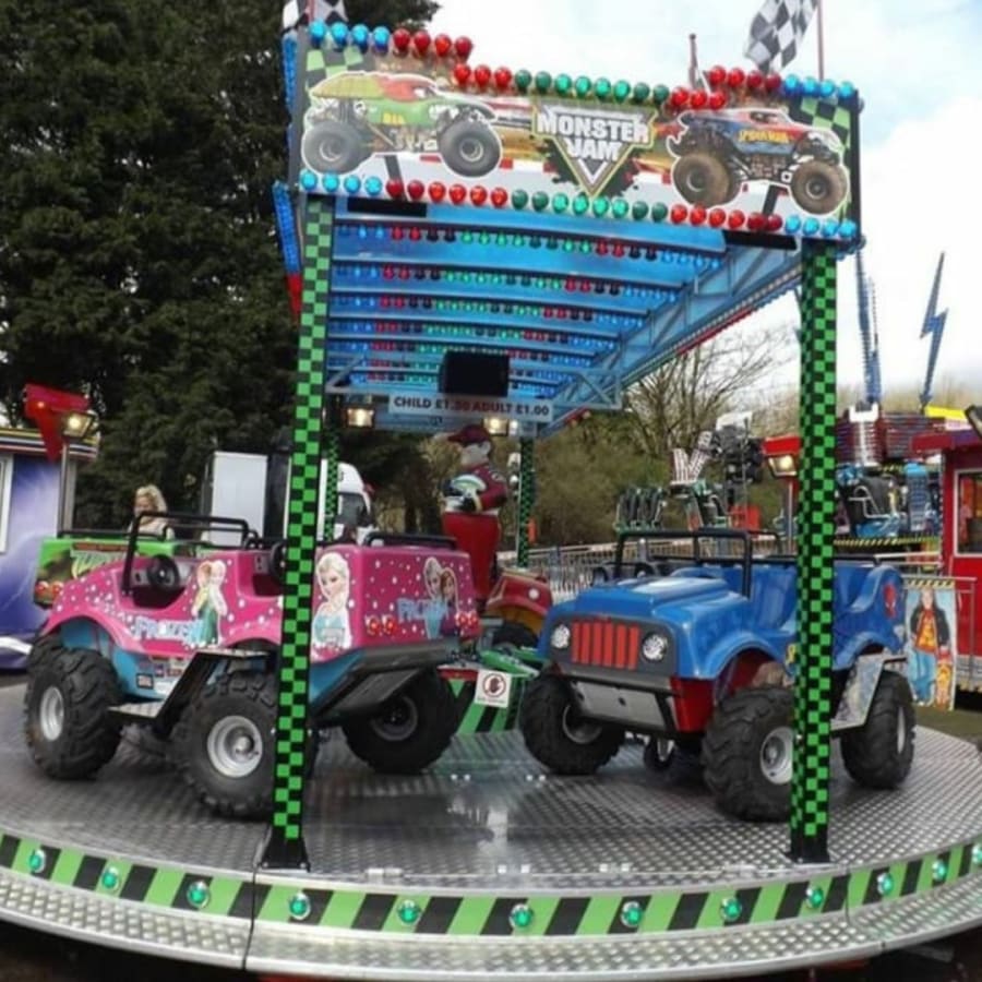 Monster Mega Trucks Childrens Track Ride for hire for all events across the UK. These large monster trucks and Jeeps give the wow factor to any little girl or boy, With their big wheels and 4 seater trucks it gives the children the feeling like they are on a dirt track in a giant version. exciting and enjoyable letting the children sit and buckle up ready for the ride ahead.