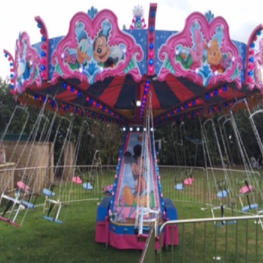 Children's Chair-O-Planes ride for hire for any events across the UK. This fantastic addition to our attractions is perfect for a funfair theme or family fun day, with all the children strapped into either the inside ring or outside ring, once secured and safety buckles on the chair o planes will begin to start and wave swing the children and the parents will begin to see What a fun and exciting attraction this is. Suitable from the ages 2+ we also have this in a vintage theme you can hire this here Childrens Traditional chair -o- planes and adult version of these here Traditional Swings and Wave Swinger / Chairs