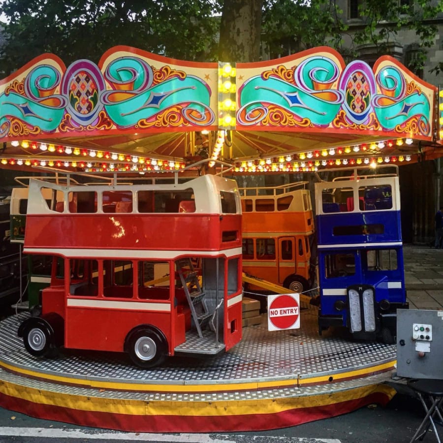Traditional Fun Fair Children's Carousel for hire in London and throughout the UK. Also known as Toy Set and Merry-Go-Round. Great addition to any funfair or event, This well known children's amusement ride is a favourite with the smaller children. Complete with busses that the children can sit behind the wheel and enjoy the ride.