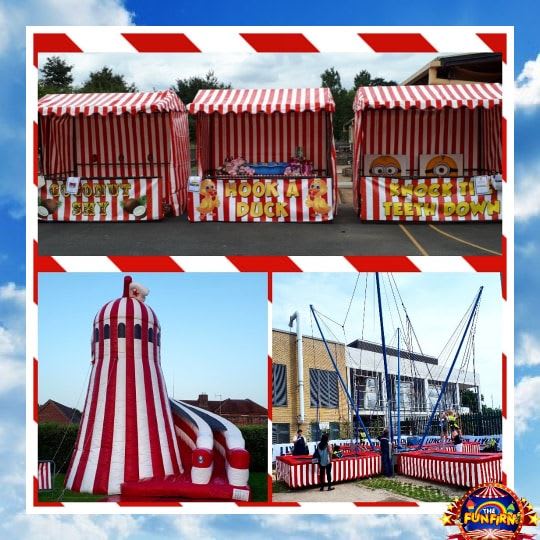 Carnival theme funfair package hire a perfect party set up. all made to match with vintage style red and white stripe theme. x3 games stalls included take your pick from all the games we have to offer here Fun Fair Side Stalls x3